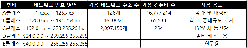 - IP 클래스는 총 5개로 나누어 지며 A, B, C, D, E 클래스로 구성되어 있음