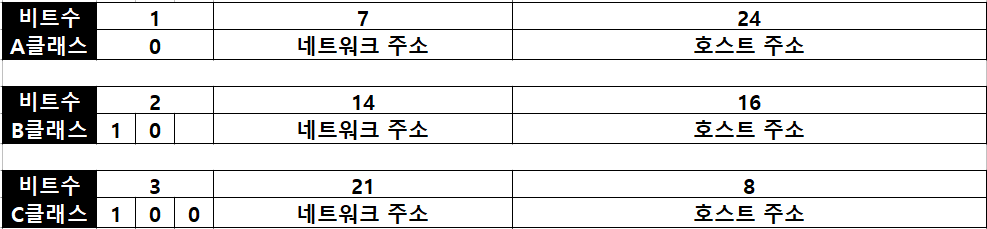 - A클래스는 가장 작은 네트워크인 1.0.0.0과 가장 큰 네트워크인 126.0.0.0까지로 규정되어 있음